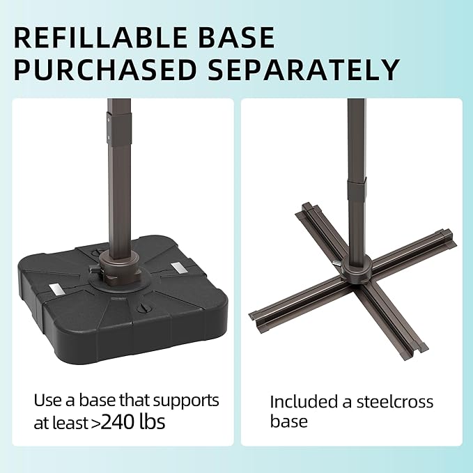 - Assembly Instruction & Tips: The umbrella come with a steel cross base but does NOT include the fillable base shown in the picture. We recommend a fillable base over 220lbs counterweights for safe and stable in outdoor use. You may refer to the installation video we uploaded in the details page. The installation is relatively simple, but since it is a large and heavy duty umbrella, so it's better for two people to work together to carry and install.