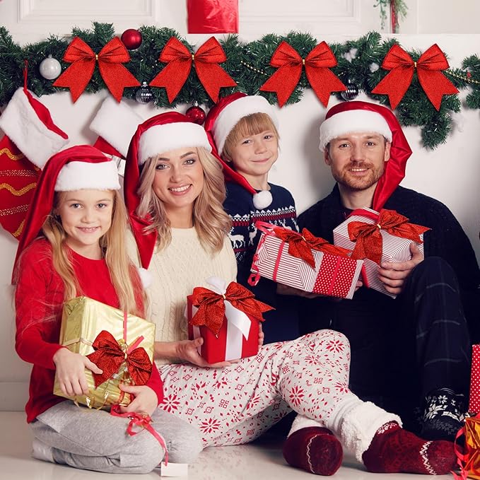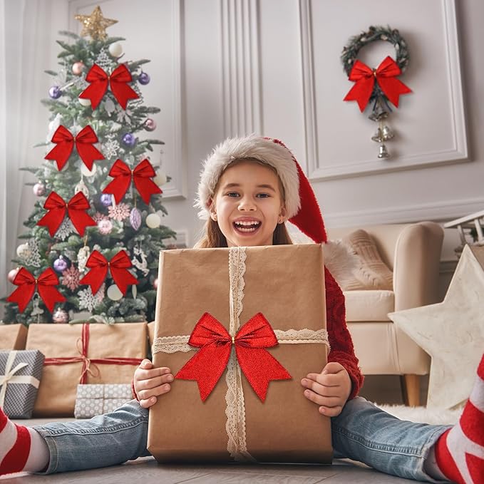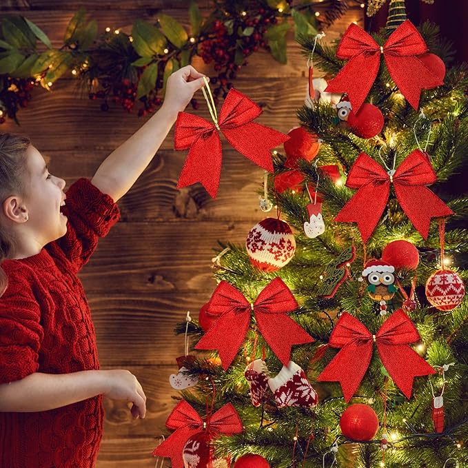 Cindeer 24 Pcs Red Christmas Bow Decorations 6 x 6 Inches, Glitter Holiday Ornaments Sequin Ties Bows for Xmas Tree, Wreath, DIY Crafts, Gift Wrapping, Party Decor