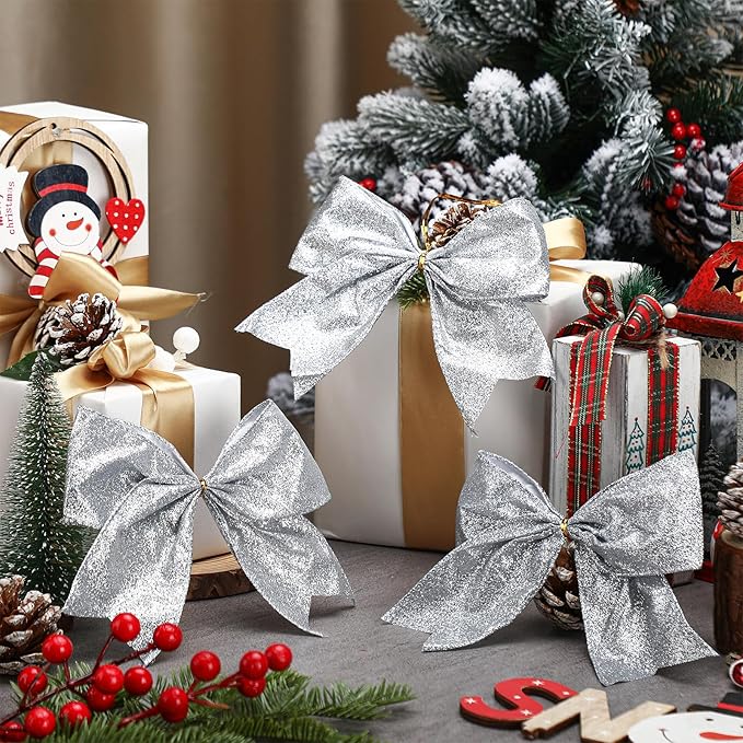 - Delicate Design: the decorative surface of the silver Christmas ornaments bows has glittering sequins, which is dazzling and eye catching; We provide you with more color choices, which can also meet your different decorative needs and add Christmas atmosphere