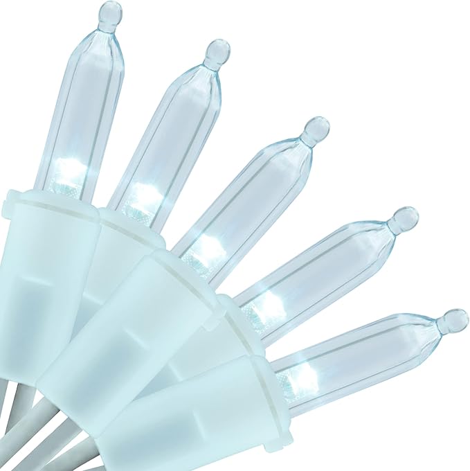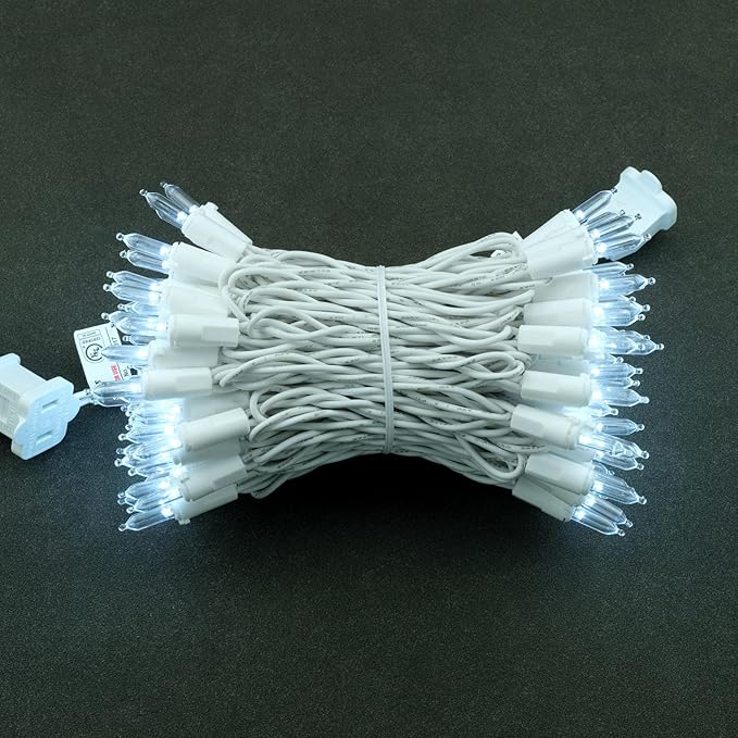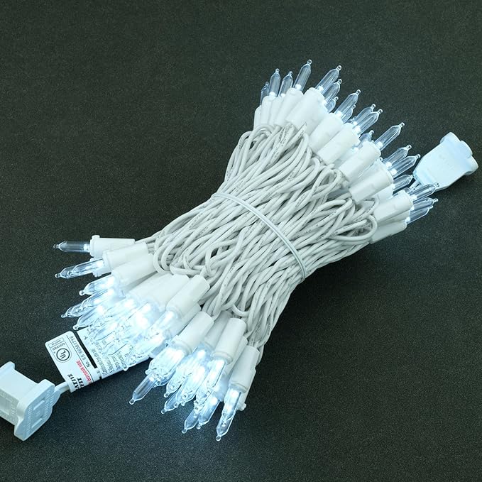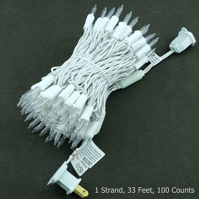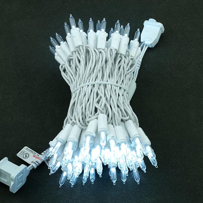 - Specifications: 33' total length of white wire with 100 cool white LED bulbs, 4" spacing, 5" lead, 5" tail. Commercial grade 22 AWG wire with pure copper core. Strings can be connected end-to-end for expansion. 4.8 watts per strand, rated for 216 watts maximum wattage and up to 45 strands can be used simultaneously. Indoor and outdoor use. To order the white Christmas tree with this lights pre-installed, please search ASIN B0CGFCF2RT.