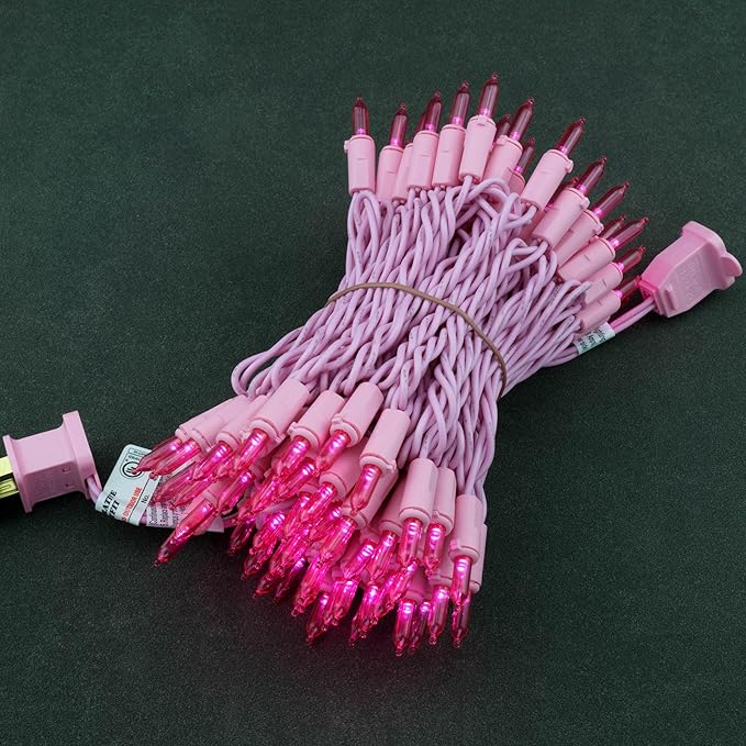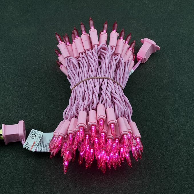 - Specifications: 33' total length of pink wire with 100 pink LED bulbs, 4" spacing, 5" lead, 5" tail. Commercial grade 22 AWG wire with pure copper core. Strings can be connected end-to-end for expansion. For longer and more lights, please search for ASIN B07VLWFWRY. To order the pink Christmas tree with this lights pre-installed, please search ASIN B0CGFCBD54.