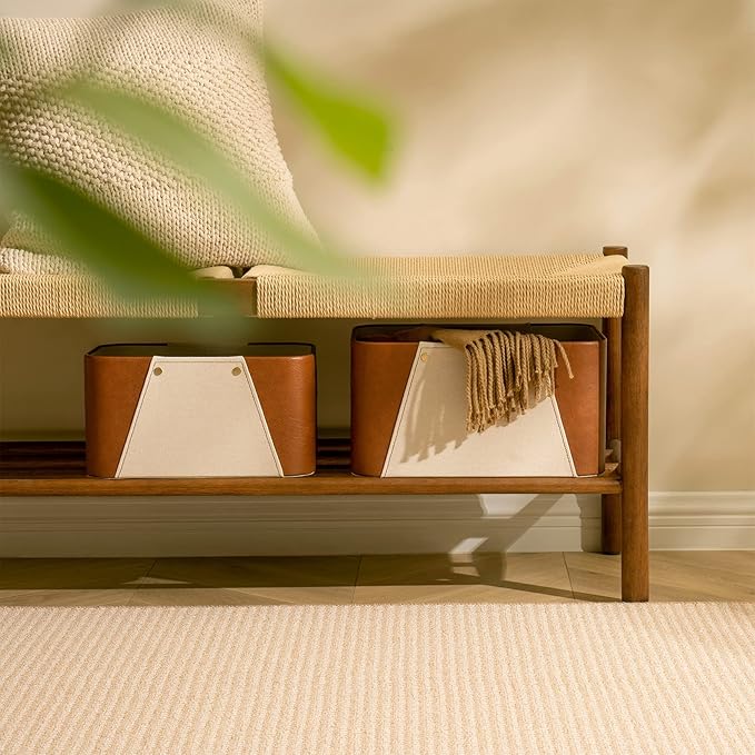LA JOLIE MUSE Storage Baskets for Organizing, 2 Pack, Storage Cube Boxes Luxury Brown Vegan Leather and Beige Greige Fabric for Closet Shelf Cabinet Bookcase