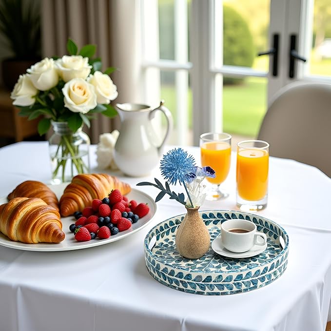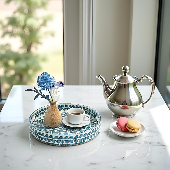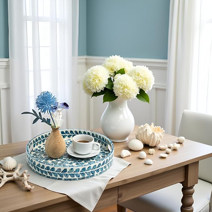 - STYLISH FLORAL TRAYS with the great workmanship by Vietnamese artisans, flawlessly finished with strong wood core and blue floral pattern well-sorted MOTHER OF PEARL SHELLS inlayed on the surface creates an elegant handmade centerpiece to brighten your decoration, best matches any beach/coastal nauticaNew Home Gifts For Homel theme.