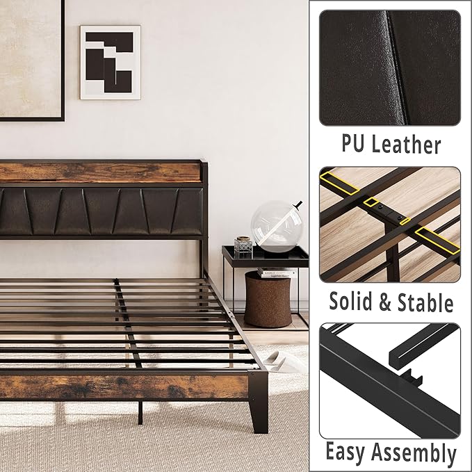 - Practical and Comfortable: Vintage shelf and black PU upholstered headboard combine practical and comfortable to match any style of the room. The bed frame made of FSC-Certified wood.