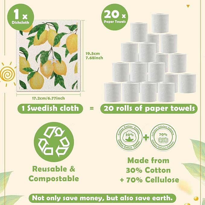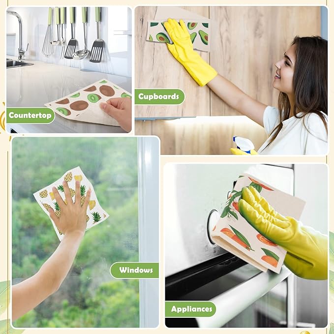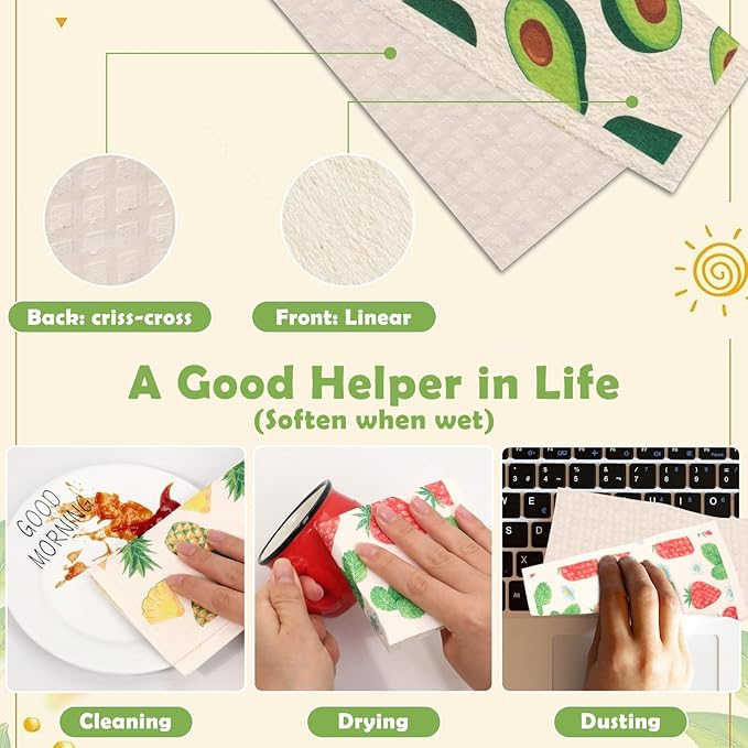 - 𝐒𝐰𝐞𝐝𝐢𝐬𝐡 𝐃𝐢𝐬𝐡 𝐂𝐥𝐨𝐭𝐡𝐬 𝐒𝐞𝐭 Swedish Kitchen dish cloths include 8 colorful fruits patterns, which are printed with cherry, strawbelly, pineapple, blueberry, orange, kiwifruit, avocado, lemon for distinguish various use and matching home décor. Each of kitchen towels is 20 x 18 cm/ 8 x 7 inches, maximize drawer space and use this to wipe our counters stove, clean up house spills and easy to throw in washing machine for quick disinfecting.