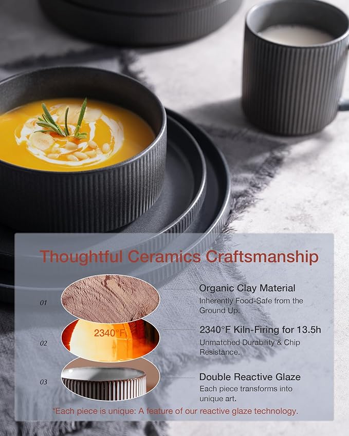 - [Premium Ceramic Durability]: Fired at 2340°F for 13.5 hours, our dishes boast impressive weight and thickness. They can resist chipping, scratching and daily wear, ensuring reliable kitchen use. Enjoy worry-free daily use, even with silverware