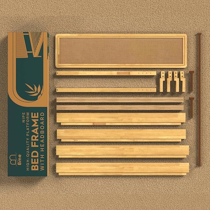 Bme Nipe Bed Frame with Headboard, Bohemian and Mid-Century Modern Style, Solid Rubber Wood Platform Bed with Slat Support, No Box Spring Needed, Easy Assembly, Queen - Natural