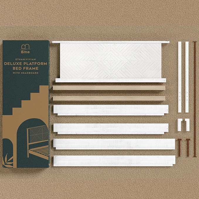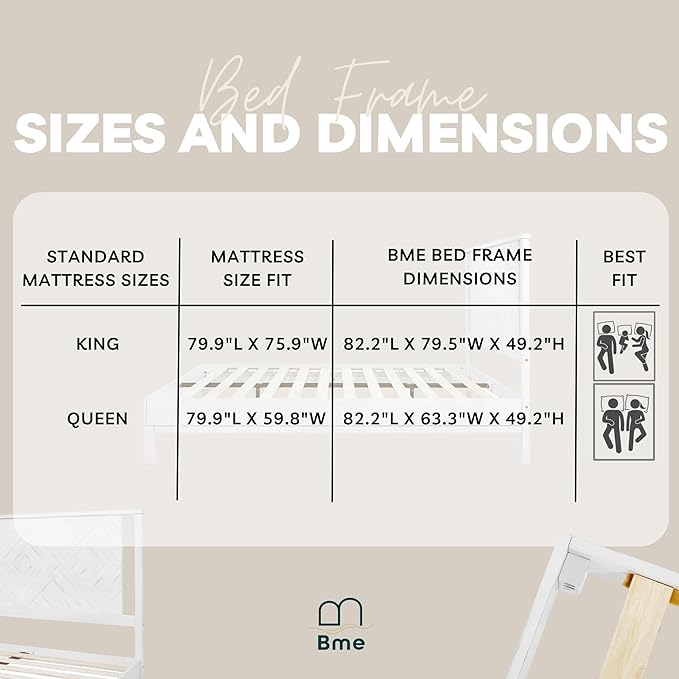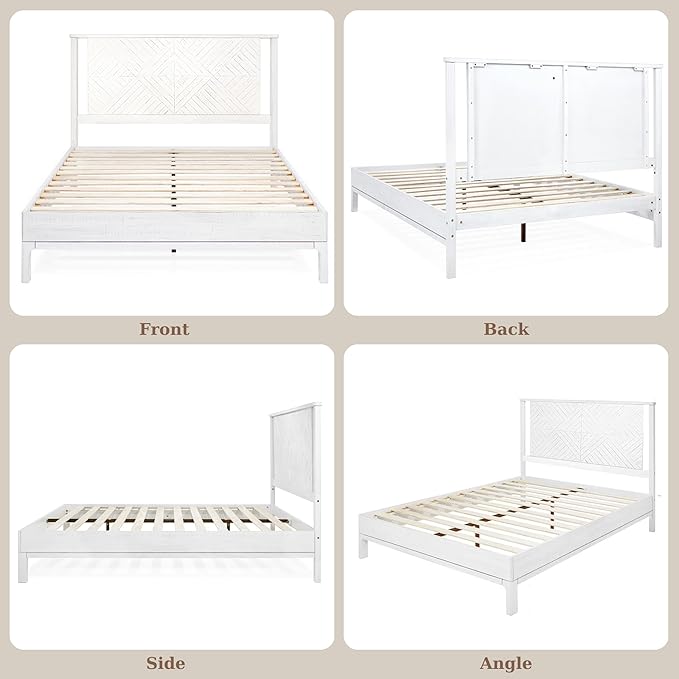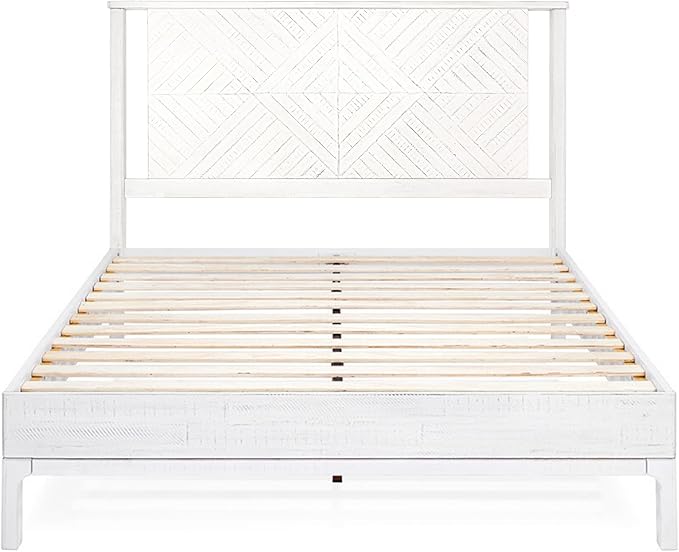 Bme Ethan Queen Bed Frame with Diamond Headboard, Mid-Century Modern, Solid Acacia Wood, No Box Spring Needed, Fits All Mattresses, Rustic White
