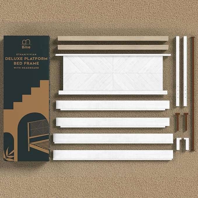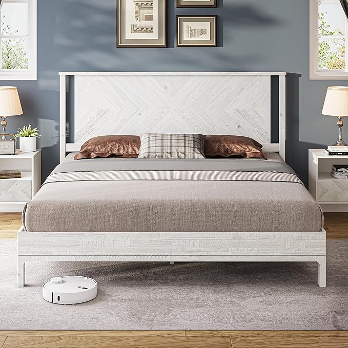 Bme Vivian 14 Inch Deluxe Bed Frame with Headboard, Rustic & Scandinavian Style with Solid Acacia Wood, No Box Spring Needed, 12 Strong Wood Slat Support, Easy Assembly, King, Rustic White