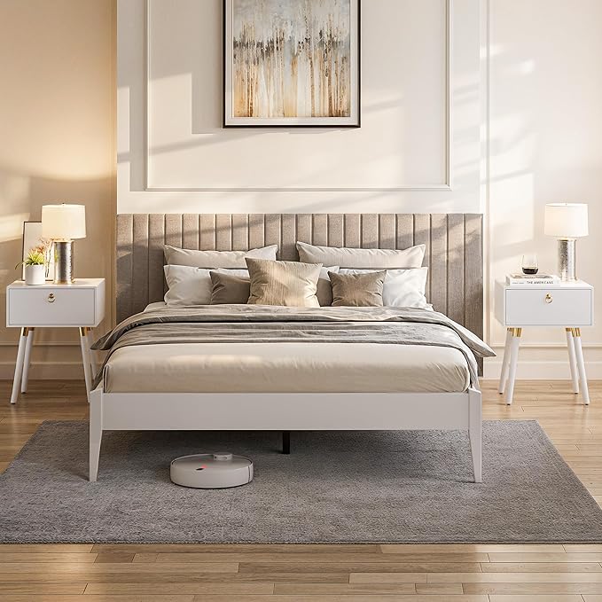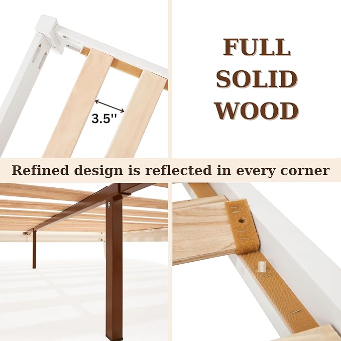 - DESIGN FOR DURABILITY: The solid wood platform bedframe queen-size and tapered legs with durable powder coated add a touch of warmth and original elements to the mid century furniture white wood queen bed no headboard; Both wood King bed frame and Queen size bed frame can support up to 800 pounds