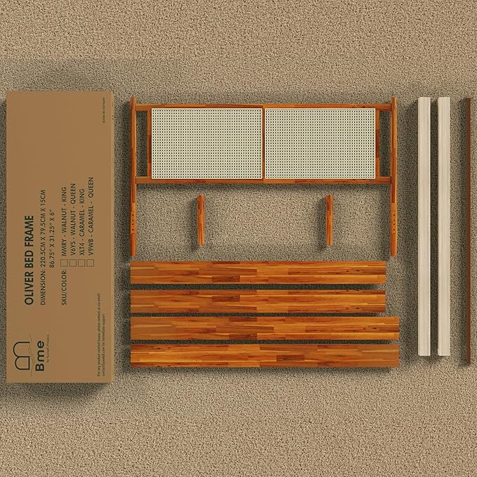 Bme Oliver King Bed Frame and Headboard - 15-Inch Signature Design with Rattan Headboard, Bohemian and Mid Century Style, 12-Slat Wood Support, No Box Spring Needed - Easy Assembly, Caramel