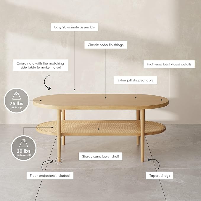 - The boho coffee table has rounded wooden details and rattan accents, giving it a high-end feel while complementing almost any home decor style.