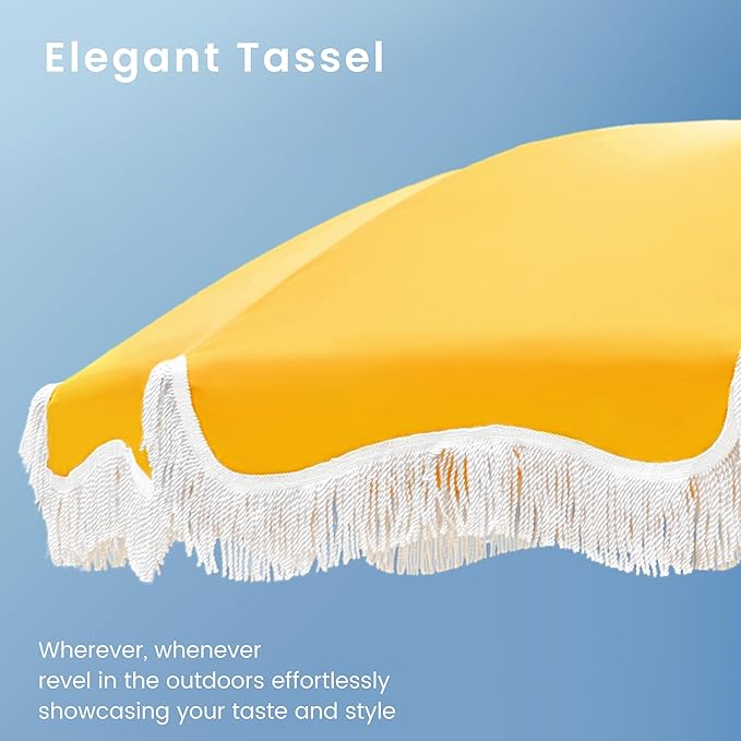- Stylish and Vibrant Fringe Design: Available in four beautiful colors—white and blue stripes, whiye, sunset yellow, and sky blue—this 7ft patio umbrella with fringe adds a pop of color to your day at the beach. Its charming tassel design not only protects you from UV rays but also makes it a perfect decoration for gardens and great for sharing