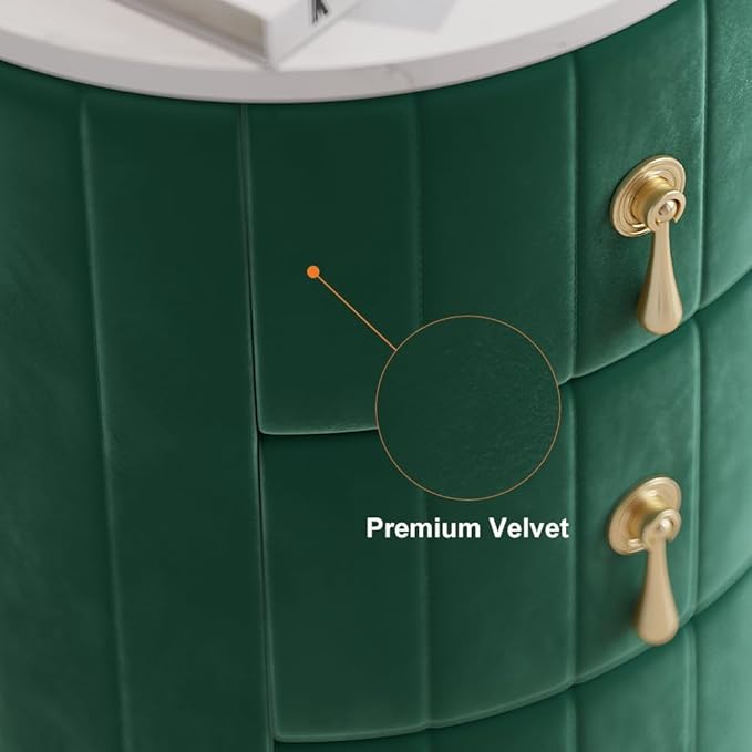 homary Green Velvet Nightstand with 3 Drawers, Round Bedside Table with Sintered Stone Top, Modern Nightstand with Storage for Bedroom, End Table for Living Room