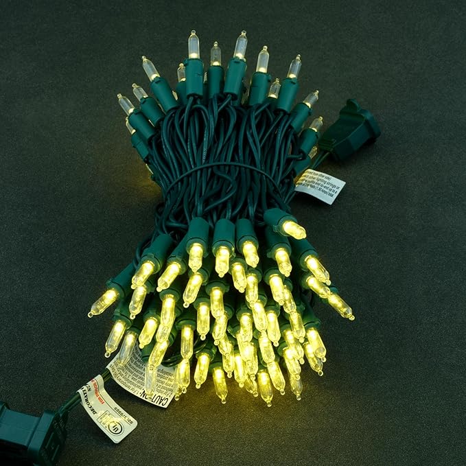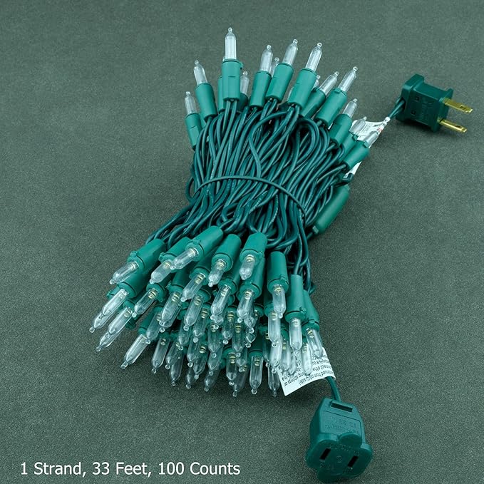 - Specifications. 33' total length of green wire with 100 warm white LED bulbs, 4" spacing, 5" lead, 5" tail. Commercial grade 22 AWG wire with pure copper core. Indoor and outdoor use. To order the Christmas tree with this lights pre-installed, please search ASIN B0CGFBYFNC or B0CGFC5661.