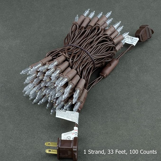 - Specifications: 33' total length of brown wire with 100 warm white LED bulbs, 4" spacing, 5" lead, 5" tail. Commercial grade 22 AWG wire with pure copper core. Strings can be connected end-to-end for expansion. 4.8 watts per strand, rated for 216 watts maximum wattage and up to 45 strands can be used simultaneously. Indoor and outdoor use. For longer and more lights, please search for ASIN B08CBF7MS8.