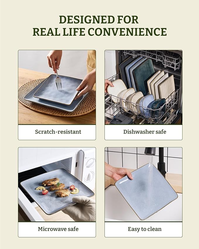 - 【12-Piece Dinnerware Set】This dish sets service for 4 that includes four large square 9.75 inch dinner plates, four 7.25 inch salad plates and four 6 inch cereal bowls. This kitchen plates and bowls set meet the need of your family well.