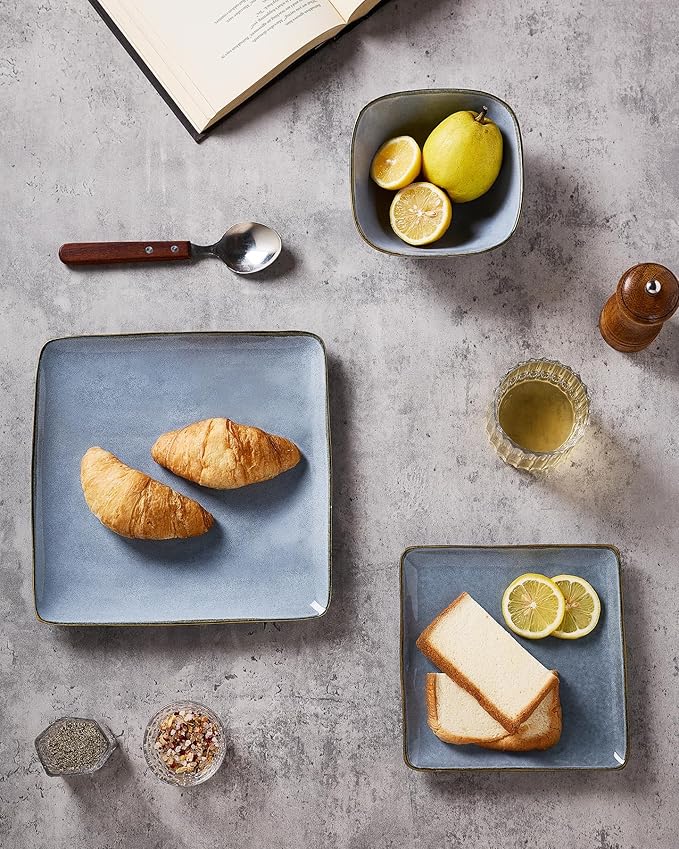 Famiware Dinnerware Sets for 4, Ocean Square 12-Piece Kitchen Plates and Bowls Sets, Reactive Glaze, Microwave and Dishwasher Safe, Scratch Resistant, Blue