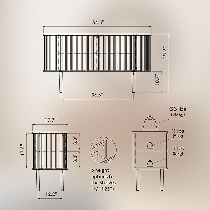 - ENJOY EFFORTLESS STORAGE as you can choose between 3 set heights for the adjustable shelf to maximize the use of the six storage spaces hidden behind the sliding doors. Walnut dining room buffet cabinet (width 54.3 ‘’ x height 29.5’’ x depth 17.7’’) offers easy access to most frequently used tableware and serving utensils.