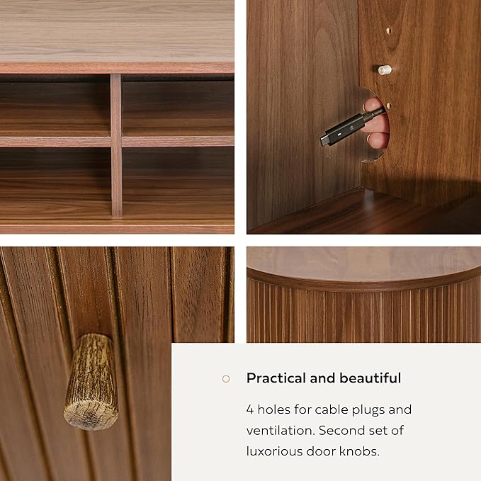 - BRING CHARACTER TO YOUR HOME by using a walnut modern tv stand which curvy corners and smoothly sliding tambour doors makes it a perfect accent cabinet. Aesthetic appeal makes it suitable for both living room tv stand and bedroom tv table. You will receive 2 sets of door knobs - wood & messing.