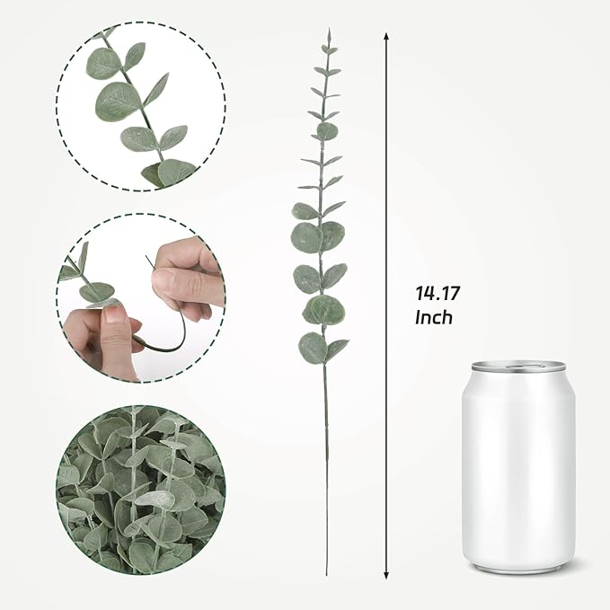 - 【Sizes of faux eucalyptus stems】 Around 14.1in/35.8cm in length, growing out with 13 leaves.