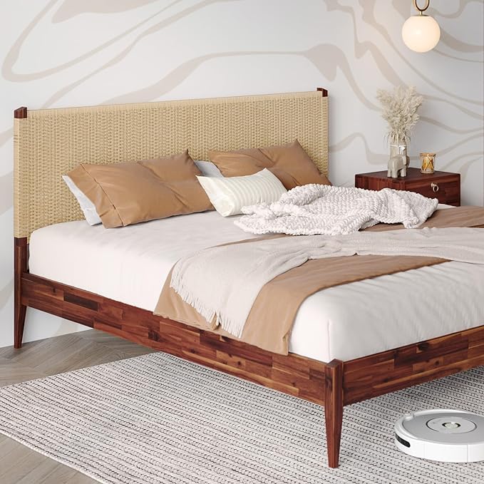 - BUILT TO LAST MATERIALS: Our exquisite king bed frame and headboard is crafted from durable solid acacia wood with a special woven headboard design; With its sturdy construction and noiseless design, you can glide effortlessly into your dreamland