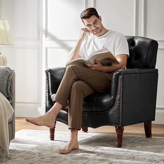 - Breathable Leather Construction- The leather accent chair Crafted with top-layer leather material. This genuine leather office chair combines scratch-resistant durability with easy-clean maintenance. Tufted leather chair can Ensure safe use for families with kids/pets.