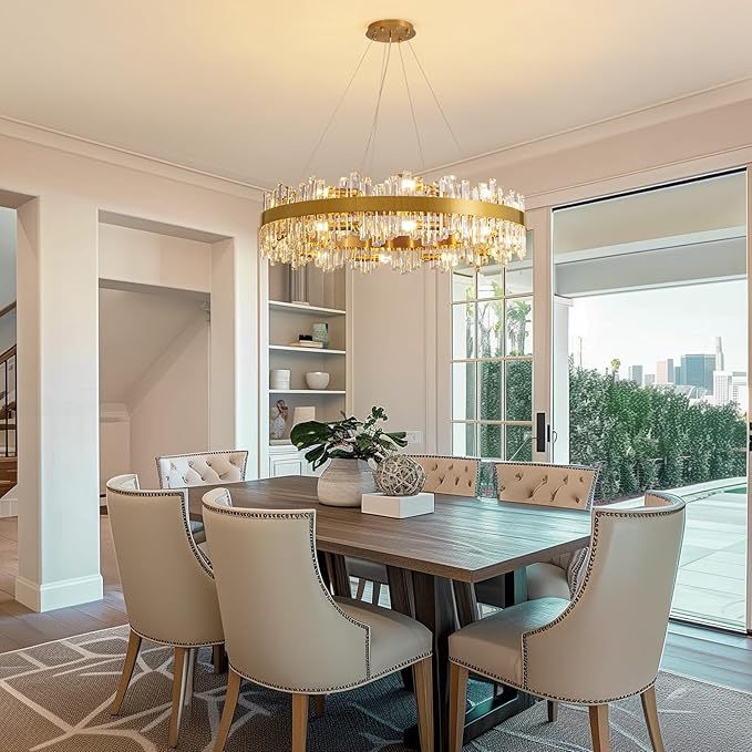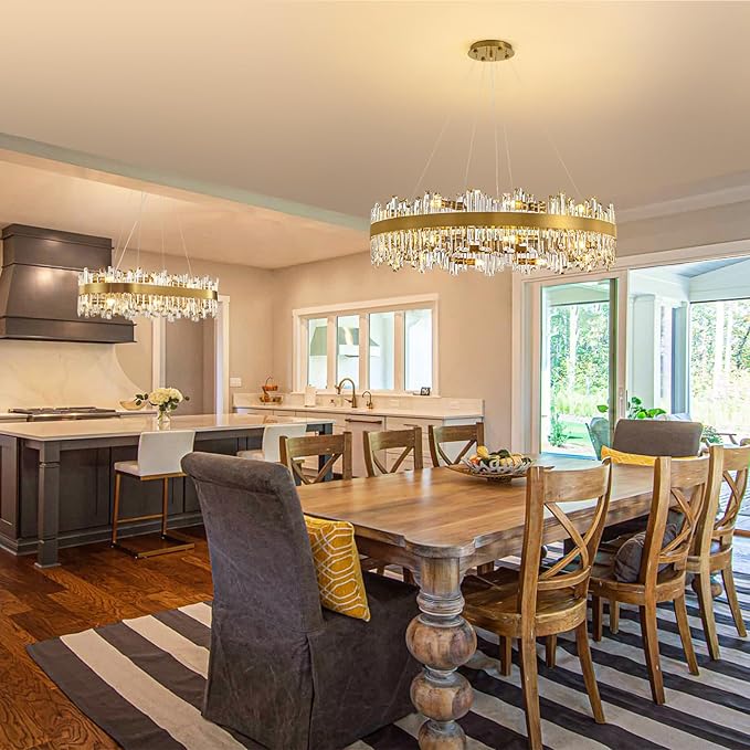 - ✨【Modern & Luxury Design】: With the high quality brushed gold stainless steel metal frame and the exquisite raindrop K9 crystals, this elegant crystal ceiling light will be the stunning focal point in your house. The light emitting through the crystal shines like diamonds and adds a sense of art & elegance to any rooms. Perfect lighting illumination for dining room, bedroom, kitchen island, living room.