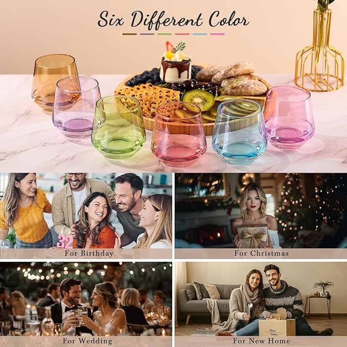 - VIBRANT COLORFUL SHORT TUMBLERS-Stemless wine glasses are the perfect option for wine lovers with busy, active households. They're a great way to enjoy delicious wine without the threat of kids or pets knocking over the glass.And the modern shape make it more easy to hold.Especially friendly for people have small or arthritic hands.The variety of vibrant colors make guests find their own cups easily at party. Meanwhile making your table setting stand out and add a touch of color to your party.