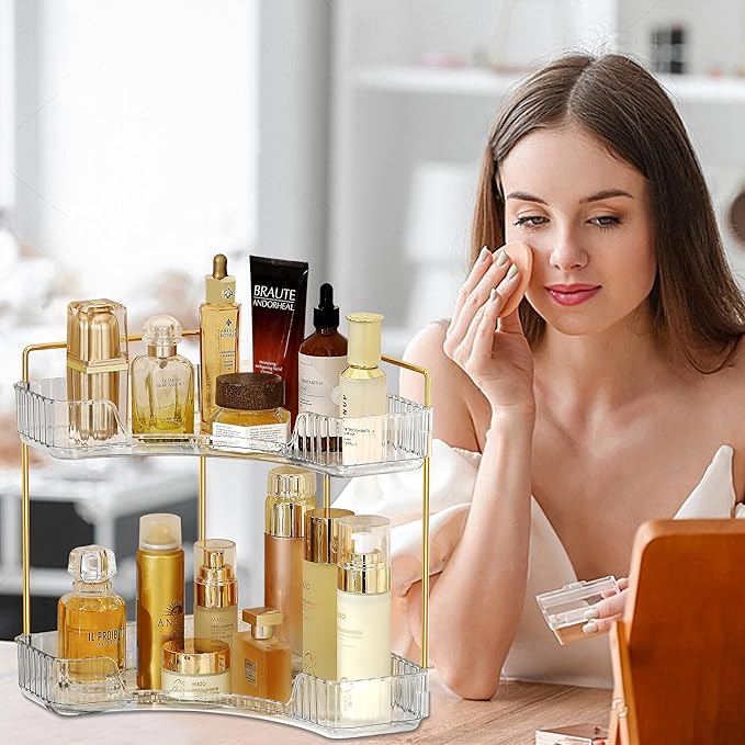 - 2-Layer Large Capacity: Our bathroom corner shelf countertop can save 80% of desktop space, with 8.3in layer spacing, to place perfume, lipstick, nail polish, powder blusher, eye shadow, base makeup, makeup powder, makeup brush, skincare, etc