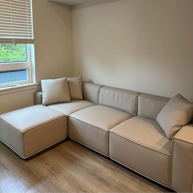 Acanva Luxury Modular Sectional Living Room Sofa Set, Modern Minimalist Style Couch with Ottoman and Chaise, L-Shape, Cream