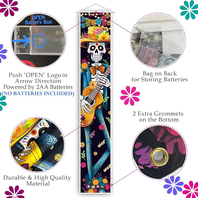- [ Add a Festive Touch to Your Halloween And Dia de los Muertos ] Suitable for Day of the Dead and Halloween decorations.Hanging up these banners in your doorways halls,front door,window,garage door,living room,etc.You can also use them as photo background etc.