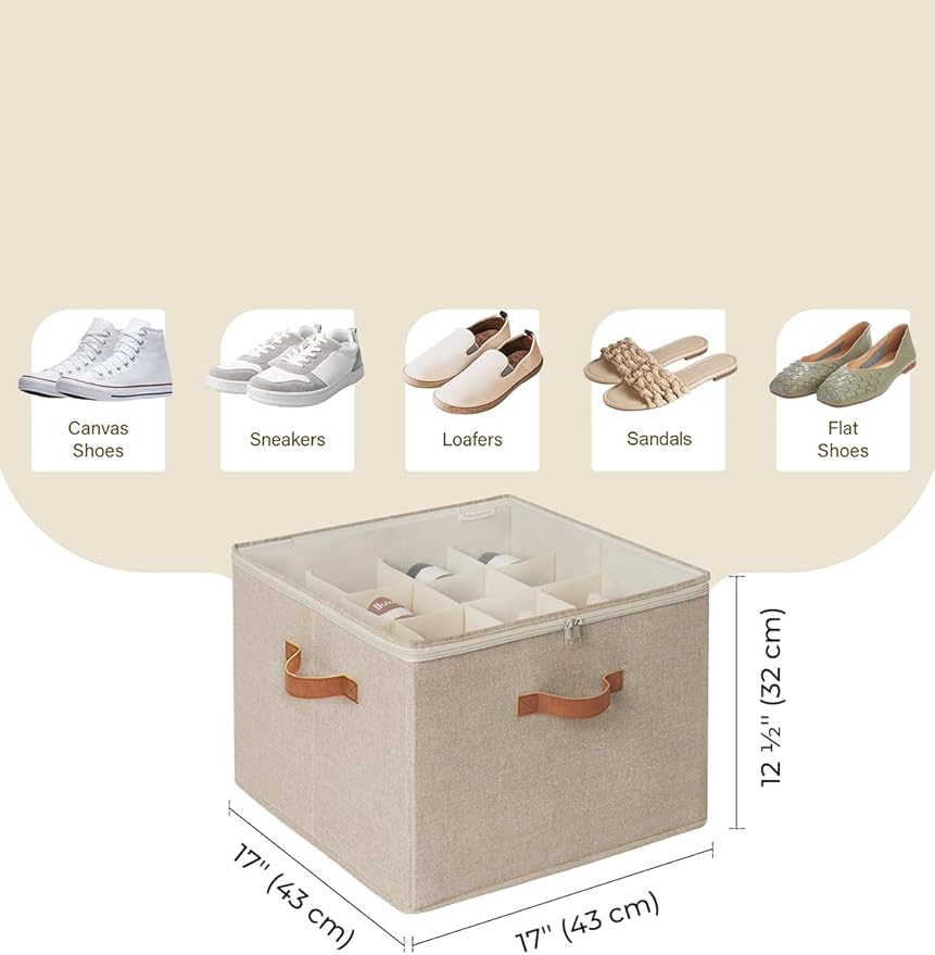 - Measuring 17" L x 17" W x 12 ½" H, this shoe storage basket can hold up to 16 pairs of shoes, making it suitable for use in living rooms, bedrooms, entryways, attics, basements, and dormitories.