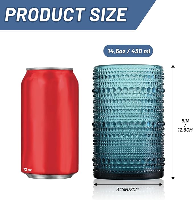Hobnail Drinking Glasses Set of 6, Vintage Colored Glassware 14.5oz, Tall Beverage Glass Cups for Water, Juice, Cocktail (Blue)