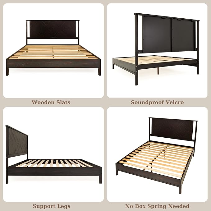 - NO BOX SPRING NEEDED: Featuring 12 well-spaced wooden slats with velcro, our king size bed frame and headboard eliminates the need for a box spring; Enjoy a sleek, supportive surface that enhances mattress stability and reduces noise
