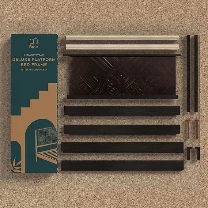 Bme Ethan Queen Bed Frame with Diamond Headboard, Mid-Century Modern, Solid Acacia Wood, No Box Spring Needed, Fits All Mattresses, Rustic Black