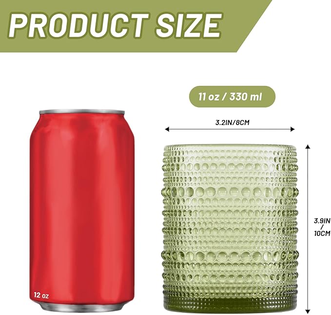 - SIZE AND CAPACITY: Each glass is 3.9 inches tall, 3.2 inches in diameter; Each glass weights about 0.75lbs, easily holds 11 fl oz liquid