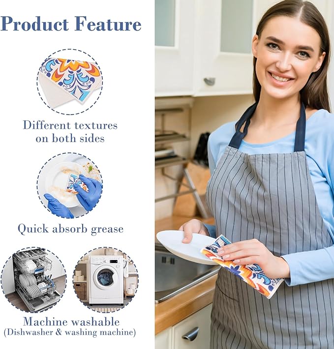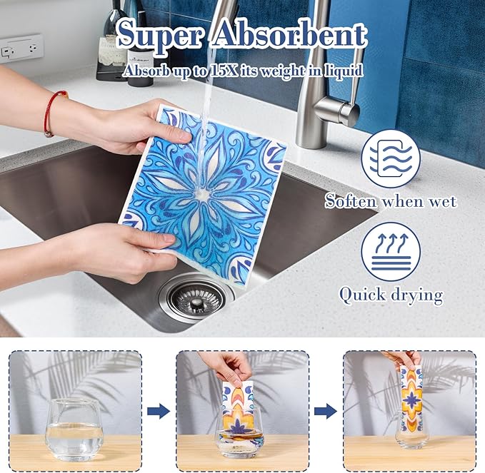 - 𝐑𝐞𝐮𝐬𝐚𝐛𝐥𝐞 𝐊𝐢𝐭𝐜𝐡𝐞𝐧 𝐃𝐢𝐬𝐡 𝐑𝐚𝐠𝐬 Made from Wood Pulp + Cotton, breathable and washable, these reusable cloths/ sponges/ towels soak up much more than a regular towel dishrag which will not leave streaks on the countertops, and they soak up stuff like flour much more easily than a traditional rag, great absorbance, soft smooth enough not to scratch surfaces but strong enough to get up grease and crumbs.