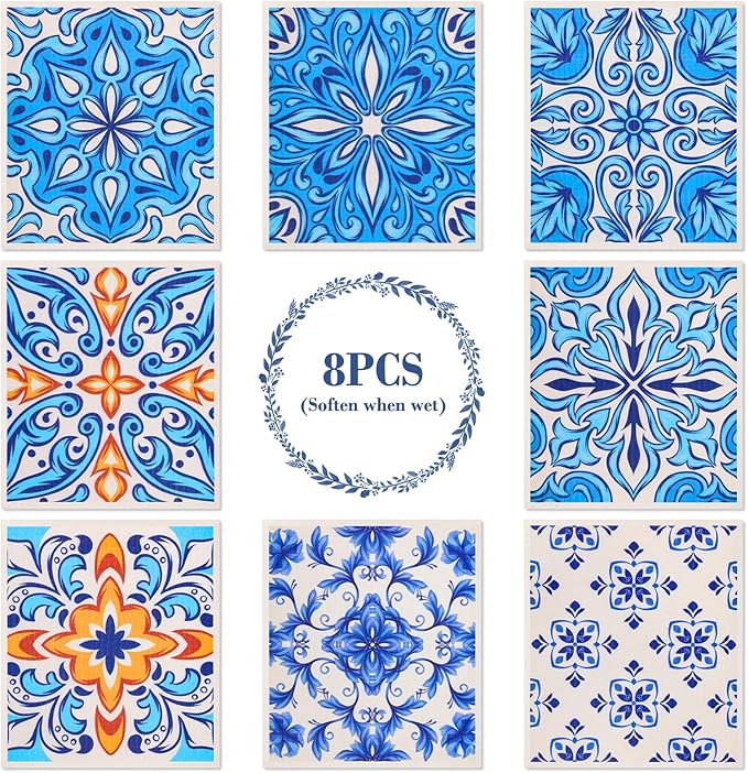 - 𝐒𝐰𝐞𝐝𝐢𝐬𝐡 𝐃𝐢𝐬𝐡 𝐂𝐥𝐨𝐭𝐡𝐬 𝐒𝐞𝐭 Swedish Kitchen dish cloths include 8 colorful patterns, which are printed for distinguish various use and matching home décor. Each of kitchen towels is 20 x 18 cm/ 8 x 7 inches, maximize drawer space and use this to wipe our counters stove, clean up house spills and easy to throw in washing machine for quick disinfecting.