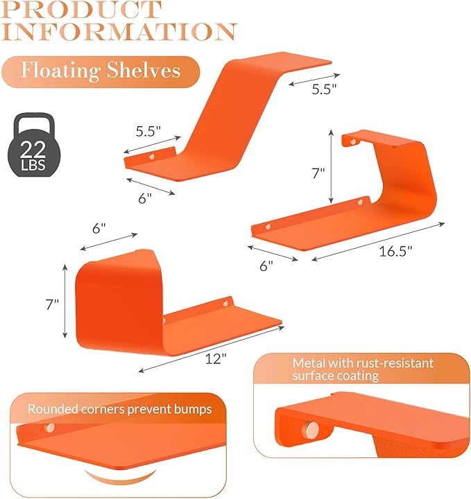 Floating Wall Shelves Set of 3, Metal Mounted Shelf with Unique Design, Bookshelf for Storage & Display in Bathroom, Bedroom, Kitchen, Living Room, Orange Home Decor