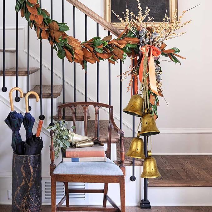 - 【Handmade】Bells hanging on a rope set is designed with a satin gold finish, Shabby Chic Rustic Style Vintage Lucky Harmony Cow Bells Wall Hanging Bells, Each bell has been individually handmade, hence small variations are possible