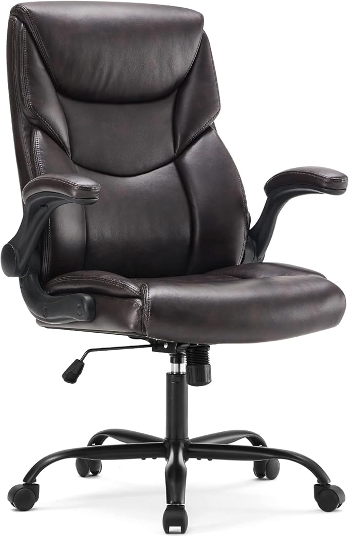 Sweetcrispy Computer Gaming Chair, Ergonomic High Back Heavy Duty Task Desk Office Chairs with Wheels, Flip-up Arms, Adjustable Height, PU Leather, Brown