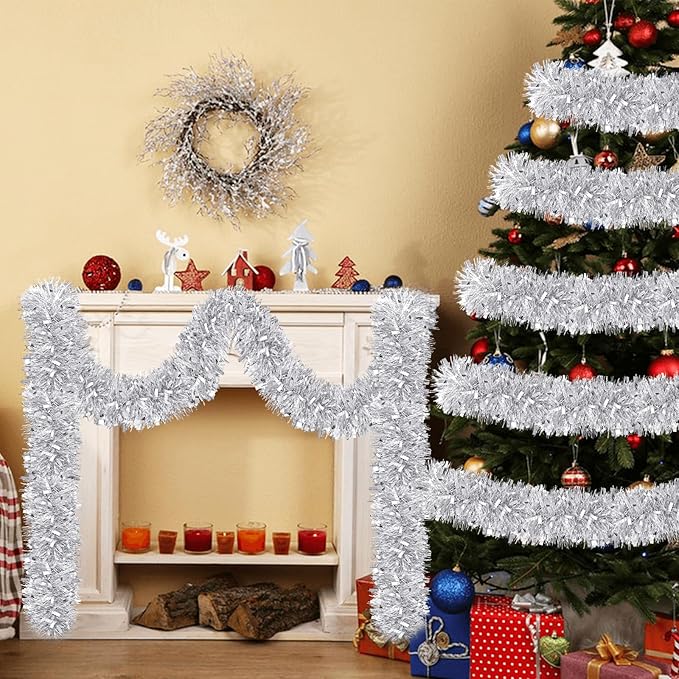 50 Feet Christmas Tinsel Garland Metallic Twist Shiny Garland for Xmas Christmas Tree Decorations,Holiday Home Party Supplies Indoor Outdoor Decor (Silver)
