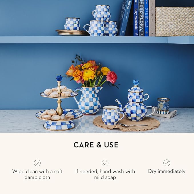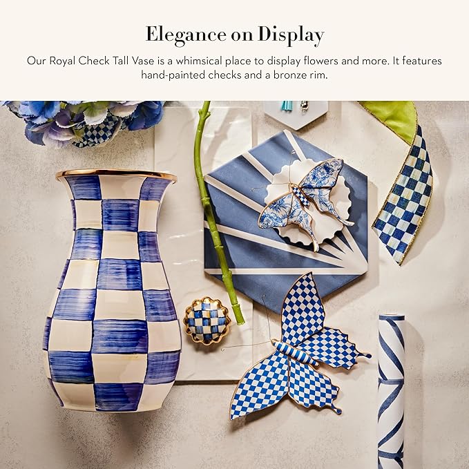MACKENZIE-CHILDS Tall Enamel Vase, Unique Flower Vase, Decorative Table Decor for Living Room, Blue-and-White Royal Check