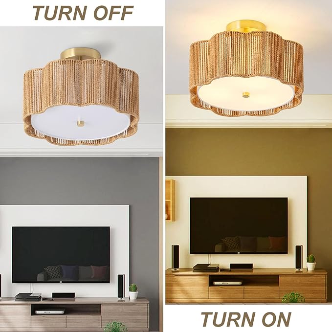 - 【Rattan Hand-Woven Ceiling Light Fixtures】 This 13.4"rattan flush mount ceiling light fixture is hand-woven by skilled artists using high-quality natural materials, embody the beliefs of natural, safety and health. Each rattan chandelier is unique and natural.