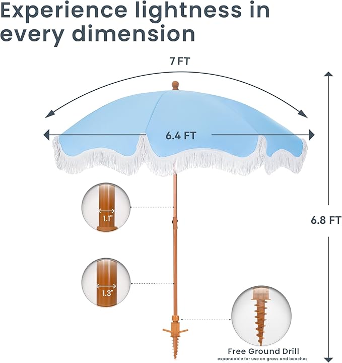 - Portable Sand Anchor for Easy Setup: PHI VILLA 7ft beach umbrella with fringe comes equipped with a removable sand anchor that allows you to easily twist and secure your large beach umbrella into sand or dirt, ensuring it stays put while you relax