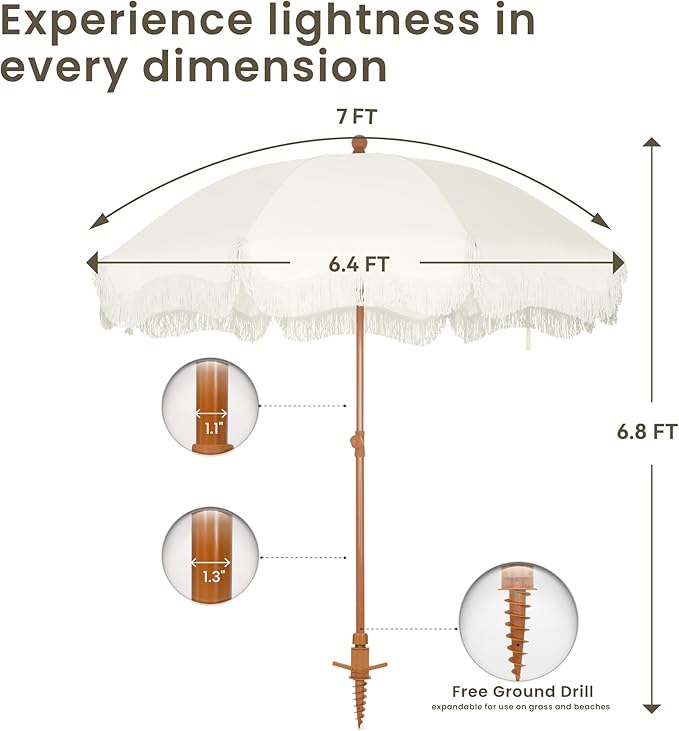 - Portable Sand Anchor for Easy Setup: PHI VILLA 7ft beach umbrella with fringe comes equipped with a removable sand anchor that allows you to easily twist and secure your large beach umbrella into sand or dirt, ensuring it stays put while you relax