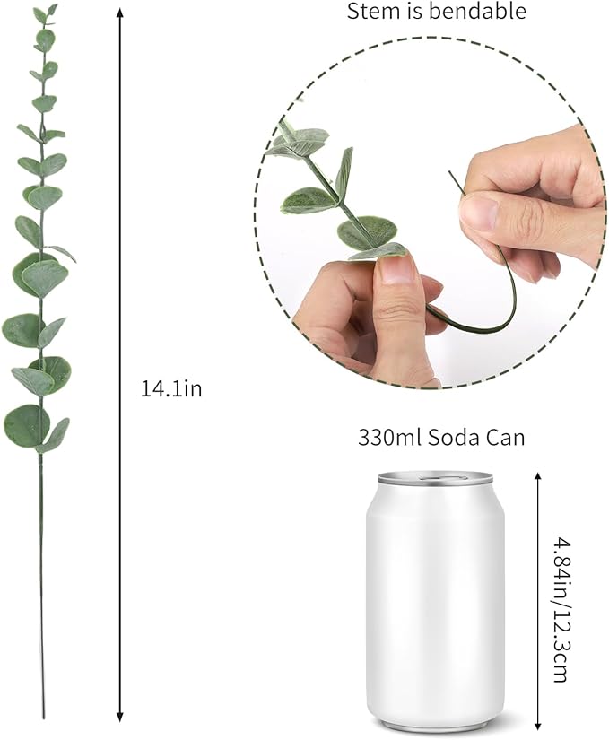 - 【Sizes of fake eucalyptus stems】 Around 14.1in/35.8cm in length, growing out with 25 leaves.