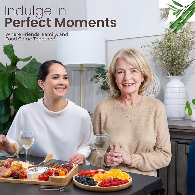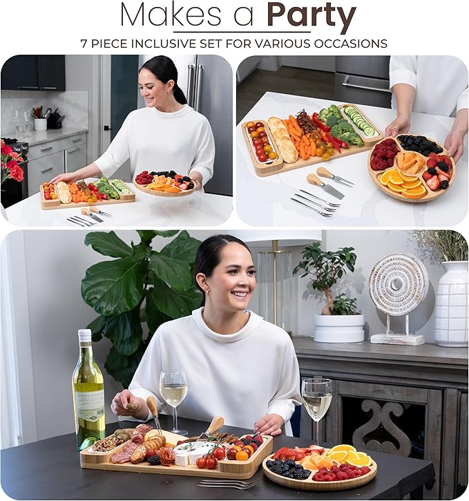 - HIGH-QUALITY BAMBOO DESIGN: Made from premium, eco-friendly bamboo, this charcuterie board set is durable, stain- and odor-resistant, and easy to clean. The polished finish highlights the natural bamboo beauty, adding a sophisticated touch to any table.