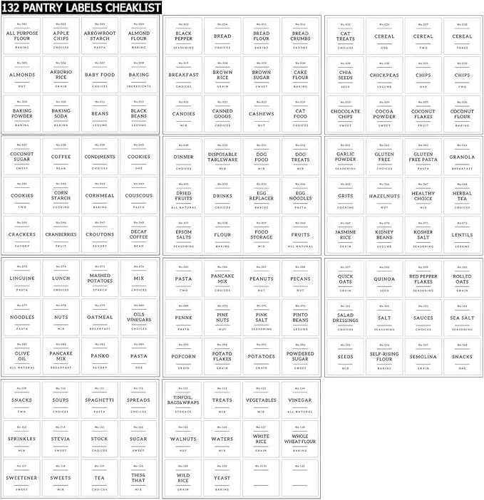 - 【PERFECT FOR PANTRY】132 Kitchen labels for containers to keep your food dry and pantry tidy. Minimalist labels are black text on white food labels stickers suitable for all airtight storage containers. Pantry decal organization labels are preprinted on premium vinyl stickers that won't tear or peel off but can easily be removed.
